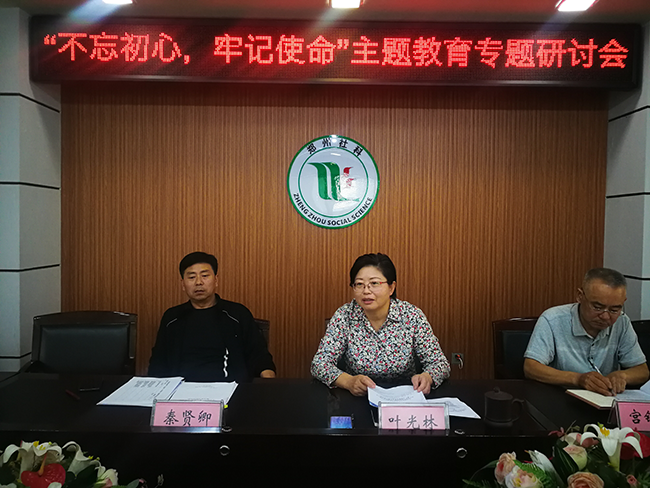 最后,叶光林同志作了重要讲话,就切实开展好“不忘初心、牢记使命”主题教育强调三个方面:一是加强理论学习,提升政治站位。要把深入学习贯彻习近平新时代中国特色社会主义思想作为这次主题教育的主线,落实到主题教育的全过程、各方面,把学深悟透习近平新时代中国特色社会主义思想作为重中之重,掌握核心要义和实践要求,增强“四个意识”、坚定“四个自信”、做到“两个维护”。二是认真贯彻总要求,担当社科使命。要按照主题教育“守初心、担使命,找差距、抓落实”的总要求,主动联系自身实际,悟初心、找初心,在整改落实解决问题中,要担使命、勇作为,自觉地找差距、抓整改、促落实。将主题教育与分管部门工作紧密结合起来,为做好郑州市社科联的工作、发展哲学社会科学事业,提供强有力的动力。三是全面落实具体目标,推动主题教育走深走实。要按照“理论学习有收获、思想政治受洗礼、干事创业敢担当、为民服务解难题、清正廉洁作表率”的具体目标,在解决突出问题上下功夫。立足社科大讲堂、社科知识大篷车进基层、社科普及周、《中州纵横》杂志等平台,深入宣讲解读习近平新时代中国特色社会主义思想,努力推动这次主题教育往深里走、往心里走、往实里走。