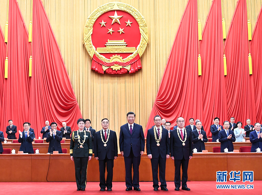栗战书宣读习近平签署的中华人民共和国主席令。主席令指出,为了隆重表彰在抗击新冠肺炎疫情斗争中作出杰出贡献的功勋模范人物,弘扬他们忠诚、担当、奉献的崇高品质,根据第十三届全国人民代表大会常务委员会第二十一次会议的决定,授予钟南山“共和国勋章”,授予张伯礼、张定宇、陈薇“人民英雄”国家荣誉称号。