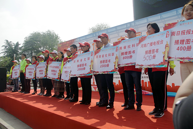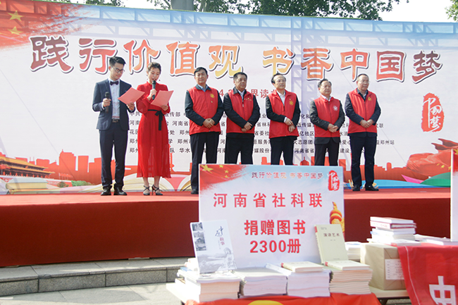 4月23日,在第24个“世界读书日”来临之际,为弘扬社会主义核心价值观,倡导全民阅读、构建书香社会,增强宣传思想战线干部的脚力、眼力、脑力、笔力,省社科联志愿服务队联合省委宣传部、省委网信办、河南日报报业集团、省文化和旅游厅、省广播电视局、省广播电视台、省社科院、中原出版传媒集团、省文联等志愿服务队,在郑州紫荆山公园共同举办了以“践行价值观,书香中国梦”为主题的世界读书日活动。